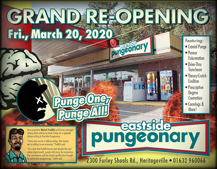 Other services offered by Eastside Pungeonary are Theory-Crutch Evultions, Prescriptive Dogma Cremations, as well as a Drive-Thru Truncheon option.